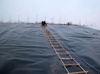 1, HDPE 水产养殖膜专门用环保,环卫:如垃圾填埋场,污水处理厂,电厂调节池,工业,固体废弃物等。靠土工膜10cm厚的保护层土料可能要过筛,杜绝有粒径多于6mm以上颗粒,不然的话易刺破土工膜。75mm厚以上HDPE膜,为防止焊缝和施工周期,选用多于6米的幅宽,池体铺设面积考虑了边甩出部分,并加班加点7%余量(锚固,搭接及漏补焊部分),沼液池施工完成后尽早注入深0`8米左右的水,以保护土工膜不被暴晒,延长土工膜的使用寿命,尤其是日晒强烈的夏日,池底无防护层的敞开式池体更应当注意。